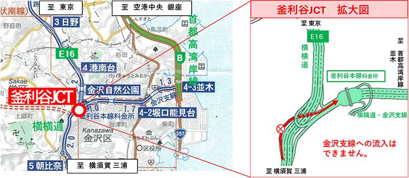 NEXCO東日本は、横横道(上り線)・釜利谷JCTの金沢支線へ流入するランプを、舗装補修工事のため夜間閉鎖する。