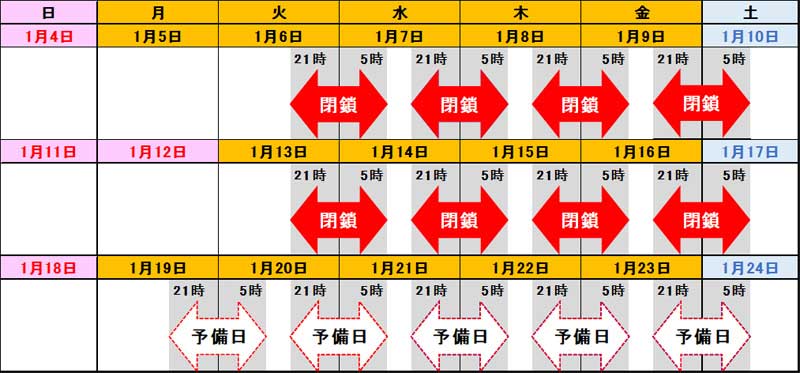 夜間閉鎖の日時は、2026年1月6日(火)~9日(金)、13日(火)~16日(金)の各日夜21時~翌朝5時。予備日は1月19日(月)~23日(金)。
