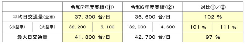 一方、小型車は1%増とほぼ横ばいだった。小型車と大型車を合計した全体の平均日交通量は、昨年度と比較して1日当たり700台多い3万7300台で2%増となった。