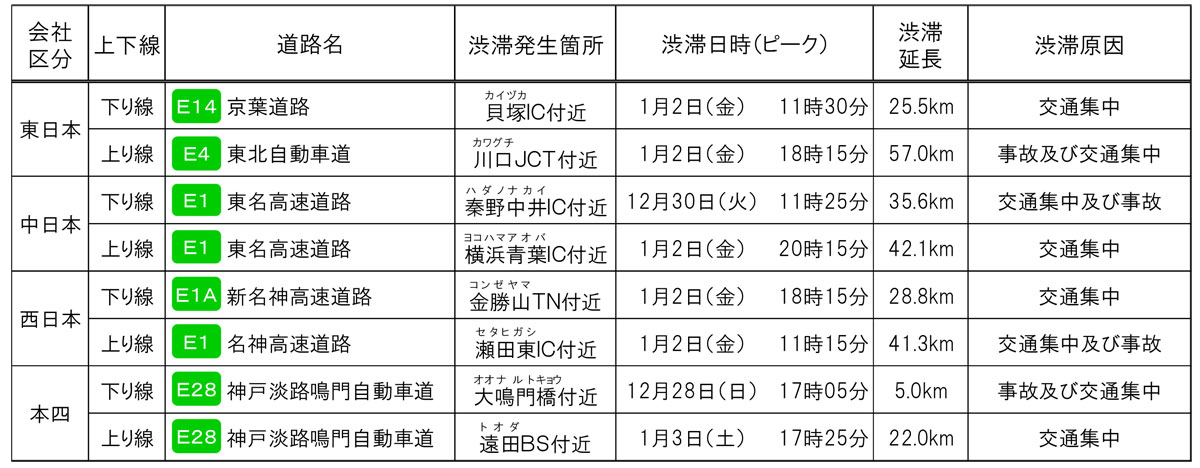 特に長い渋滞となったのは、2日の東北道、東名、名神でいずれも上り線。東北道は川口JCT付近で57km、東名は横浜青葉IC付近で42.1km、名神は瀬田東IC付近で41.3kmとなった。下り線は12月30日の東名・秦野中井IC付近で35.6kmの渋滞が発生した。