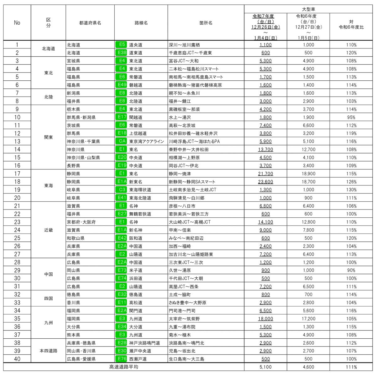 NEXCO3社及び本四高速が公表した年末年始期間(2025年12月26日~2026年1月4日)の全国高速道路の交通状況(速報)によると、大型車の平均日交通量は5100台で昨年度より11%増加したことがわかった。