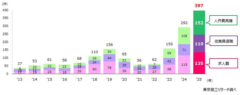 東京商工リサーチによると、2025年に人手不足に起因した倒産件数が過去最高となったことがわかった。