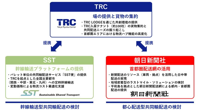 この現状を受け、TRCは100社以上のテナント企業が入居する都市型物流拠点として、共同輸配送オープンプラットフォームを活用した幹線輸配送サービス「SST便」を提供するSSTと、首都圏全域をカバーする配送ネットワークを有する朝日新聞社との連携を図る。これにより、出荷から配送(ラストマイル)までを一気通貫でカバーする新たな共同輸配送モデルの構築を目指す。