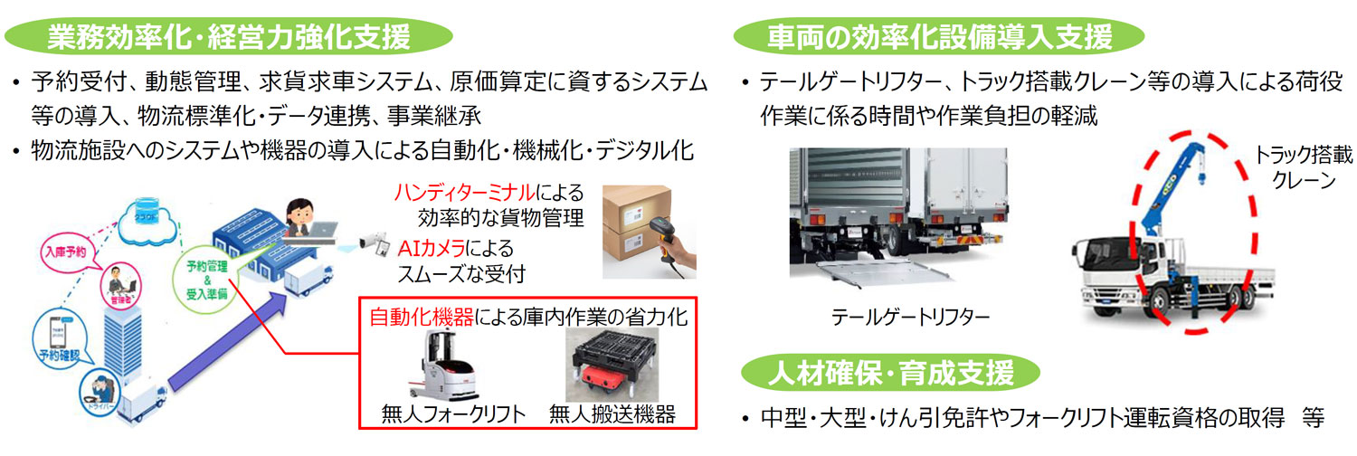 具体的には、業務効率化・経営力強化支援として、予約受付、動態管理、求貨求車システム、原価算定に資するシステム等の導入、物流標準化・データ連携、事業継承を支援する。