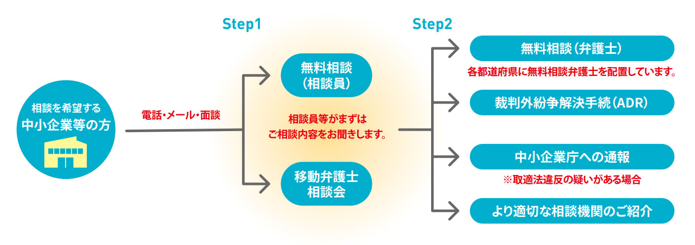 取適法の厳正な執行では、取適法等に基づく書面調査を実施するほか、法執行に必要な体制を構築。また、中小企業の取引上の悩みについて、無料で相談員・弁護士が相談に応じる「取引かけこみ寺」を運営する。
