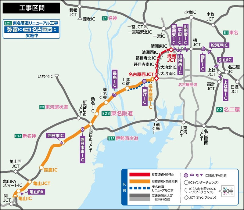 NEXCO中日本は、4月1日(水)~24日(金)まで名二環および東名阪道で集中工事を行う。