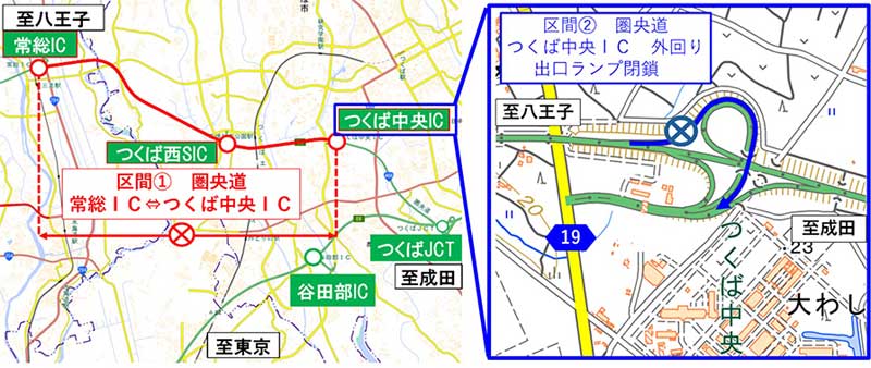 NEXCO東日本は、圏央道・常総IC~つくば中央IC(内外回り)で4車線化に伴う舗装工事を行うため、夜間通行止めを実施する。また、圏央道外回り側のつくば中央IC出口ランプを、IC改築工事のため昼夜連続ランプ閉鎖を実施する。