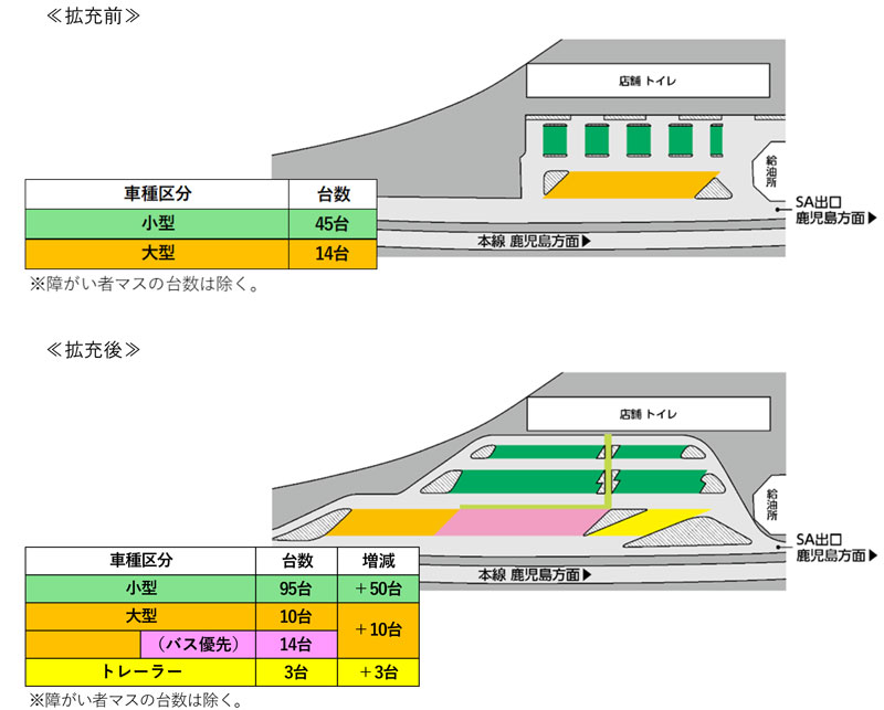 SA内のレイアウトを変更することで、これまで14台分だった大型車駐車マスは10台分増えて24台(内バス優先14台)となり、トレーラ駐車マスも3台新設された。また小型車駐車マスも、50台増え95台となった。