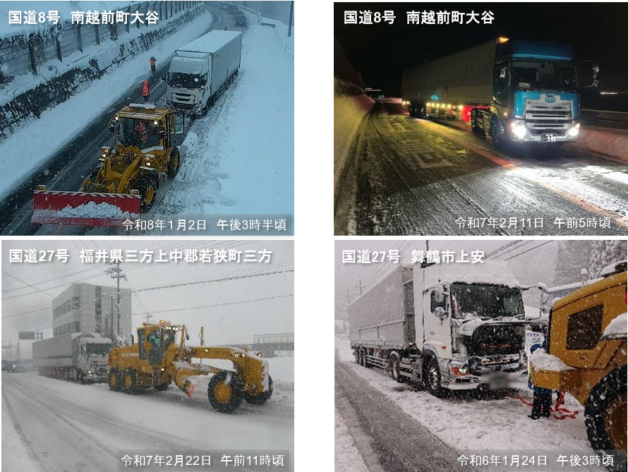 直轄国道及び高速道路では、大雪時の大規模な車両滞留を防ぐため、降雪状況によって 予防的通行止めを実施する場合があると注意を呼びかけている。