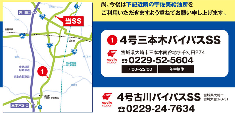 同社では、同給油所閉店後は4号三本木バイパスSS(大崎市三本木南谷地字千刈田274:出光マーク)の利用を要請している。