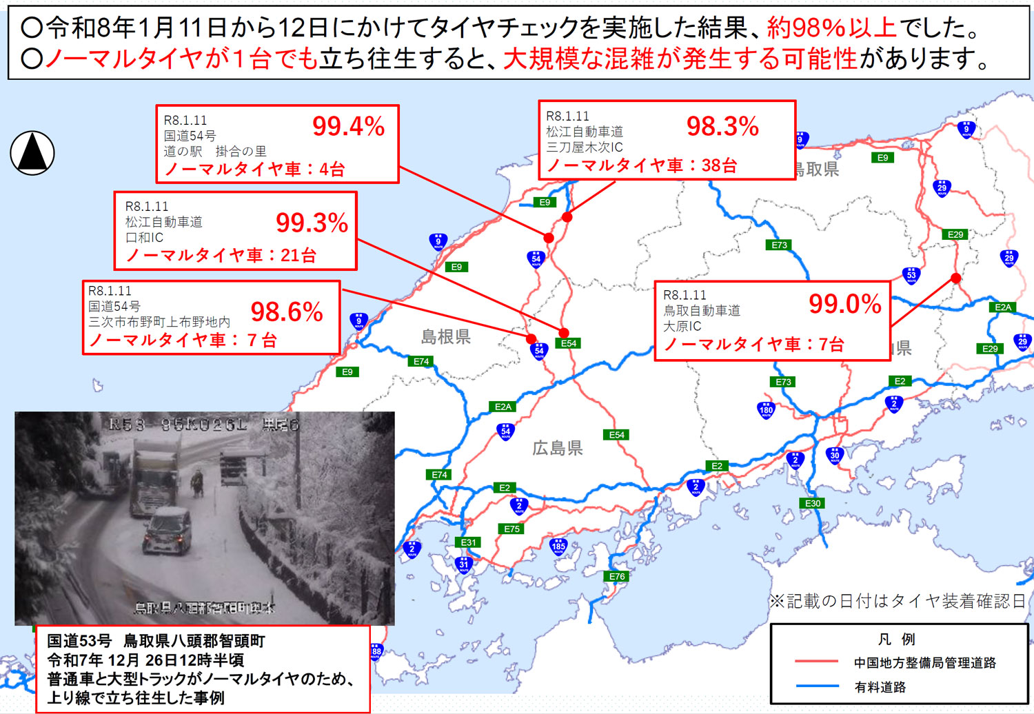 タイヤチェックの詳細は、国道54号・三次市布野町上布野地内で装着率98.6%(ノーマルタイヤ車7台)、松江道・日和ICで同99.3%(同21台)、国道54号・道の駅掛合の里で同99.4%(同4台)、松江道・三刀屋木次ICで同98.3%(同38台)、鳥取道・大原ICで同99.0%(同7台)だった。