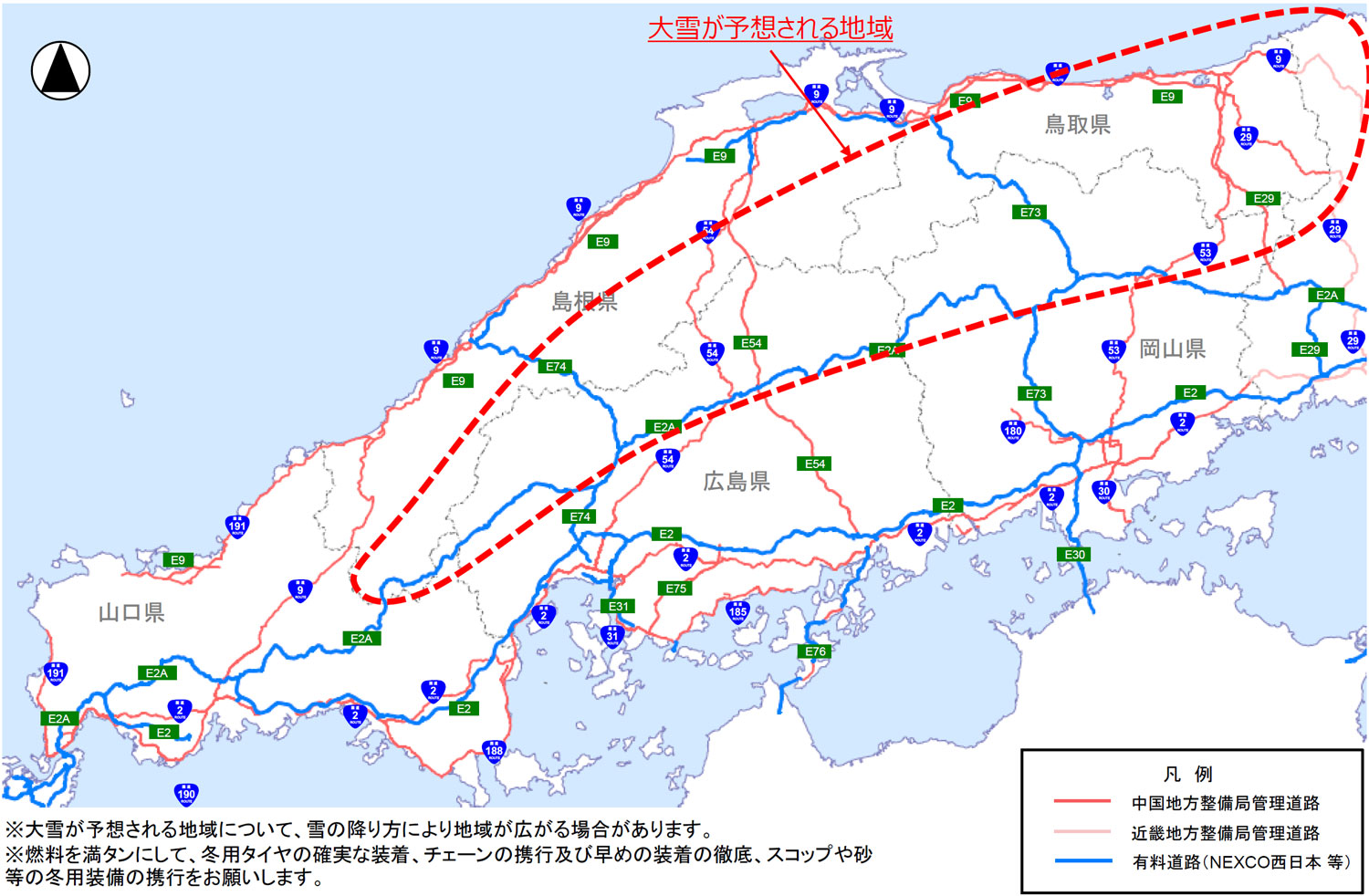 中国地方では、1月21日から25日頃にかけて強い寒気が流れ込み冬型の気圧配置が続く見込み。このため、中国地方では、鳥取県や中国山地を中心に大雪となる見込みで、短時間に降雪が強まるおそれもある。降雪期間が長くなると、積雪が多くなり、交通障害の発生する可能性もある。特に、1月21日から22日は、鳥取県では、予想以上に雪雲が発達し同じ所で降り続いた場合には、警報級の大雪となる可能性がある。