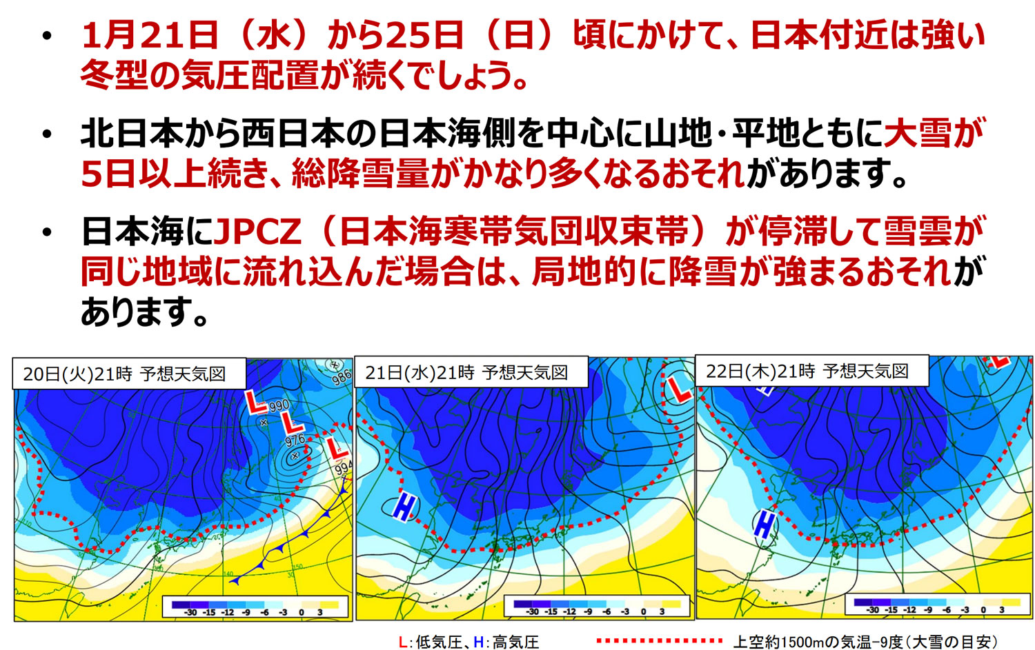 1月21日から25日頃にかけて、日本付近は強い冬型の気圧配置が続く見込み。このため、北日本から西日本の日本海側を中心に山地・平地ともに大雪が5日以上続き、総降雪量がかなり多くなるおそれがある。日本海にJPCZ(日本海寒帯気団収束帯)が停滞して雪雲が同じ地域に流れ込んだ場合は、局地的に降雪が強まるおそれがあることに対応した措置。