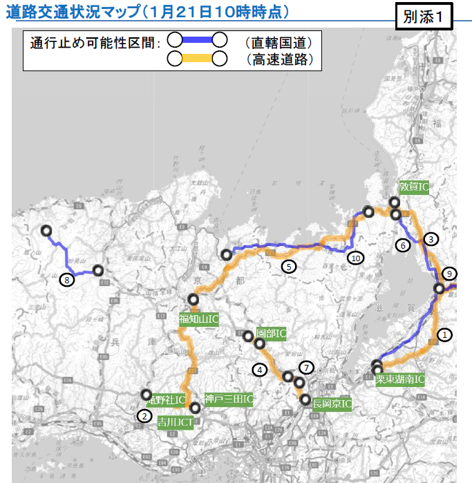 近畿地方整備局、NEXCO西日本、NEXCO中日本、阪神高速、本四高速は、1月21日10時現在で、大雪の影響による通行止めの可能性の高い区間を発表した。