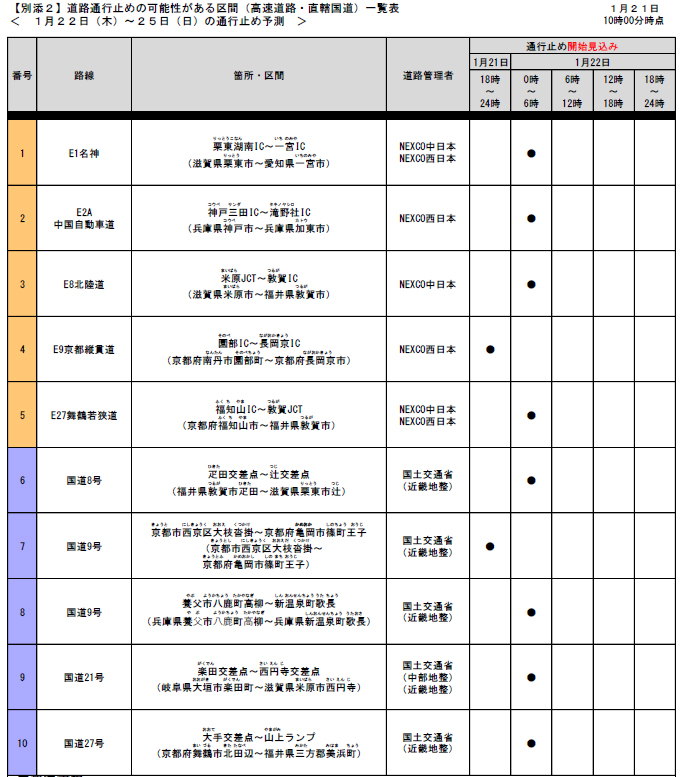 直轄国道は、8号・疋田交差点(福井県敦賀市)~辻交差点(滋賀県栗東市)、9号・兵庫県養父市八鹿町高柳~兵庫県新温泉町歌長、21号・楽田町交差点(岐阜県大垣市)~西円寺交差点(滋賀県米原市)、27号・大手交差点(京都府舞鶴市北田辺地先)~山上ランプ(福井県三方郡美浜町山上地先)は22日0時~6時に通行止めを開始する見込み。