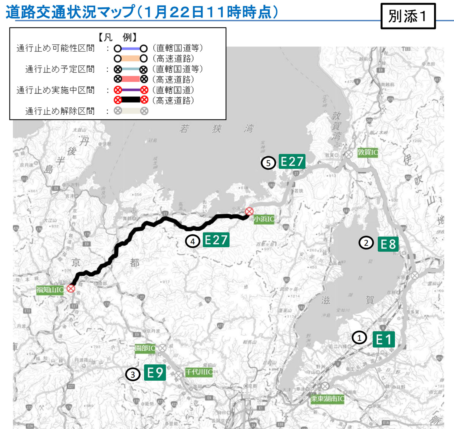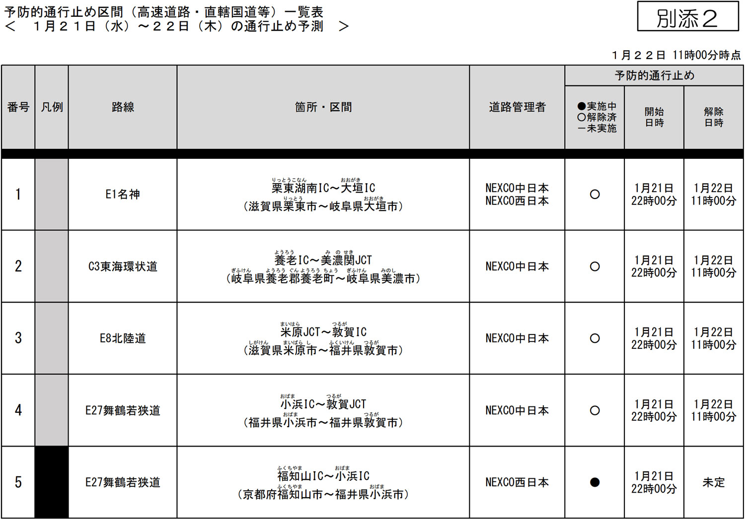 - 名神・北陸道・舞鶴若狭道・東海環状道/栗東湖南IC~一宮IC、米原JCT~敦賀ICなどで通行止め継続(22日9時) (01月22日)
