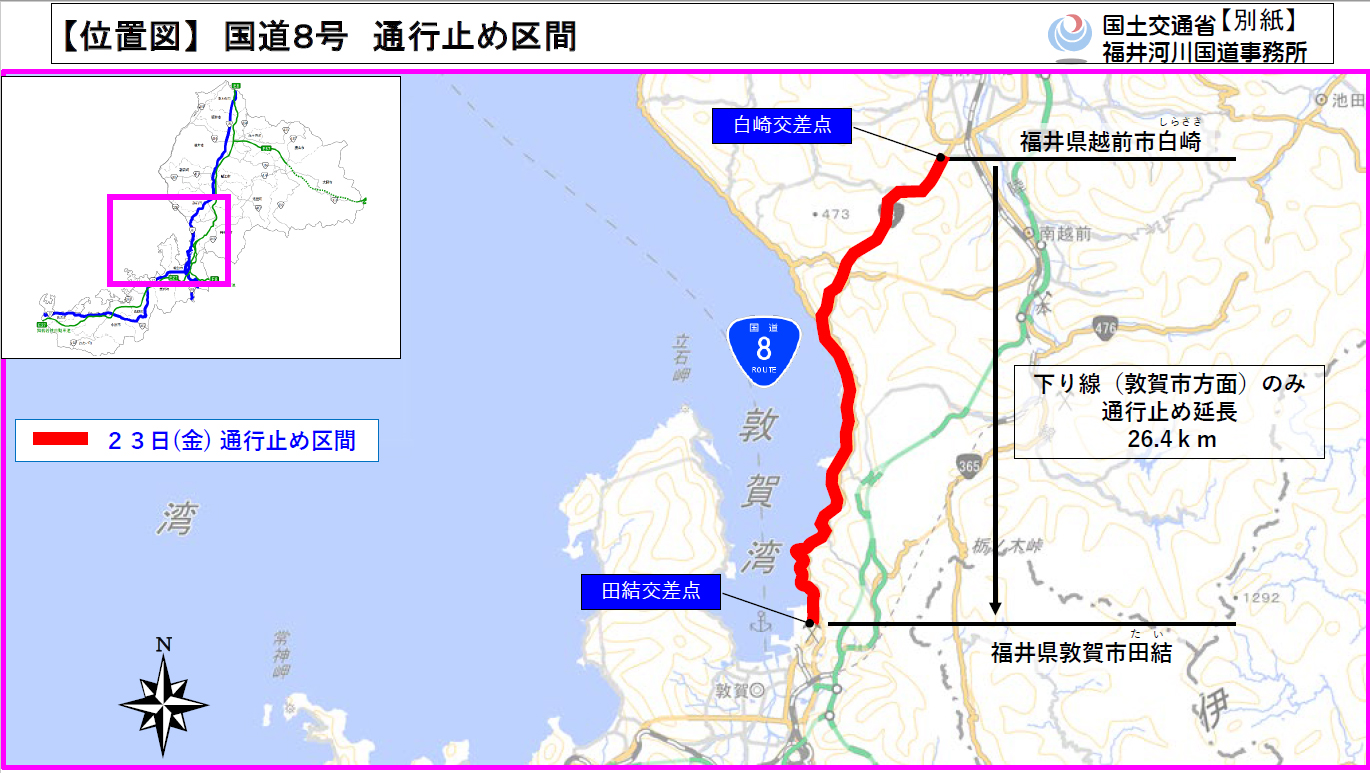 近畿地方整備局福井河川国道事務所は、1月23日8時45分、国道8号の白崎交差点から田結交差点を除雪等の影響により通知止めとした。