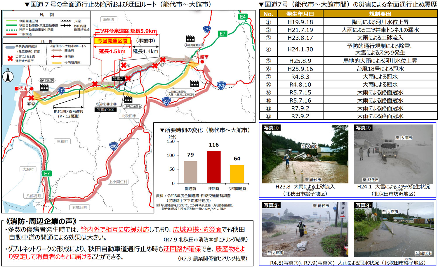 二ツ井今泉道路の現道や秋田自動車道の未開通区間には迂回路がなく、国道7号の通行止め時に広域迂回が発生していた。今回の開通により、現道区間の災害時における代替性を確保できる。