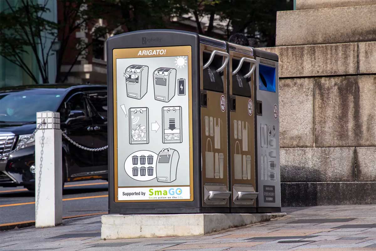 「スマゴ」はソーラー発電で稼働し、ゴミを自動で約5分の1に圧縮・通信管理するスマートごみ箱。蓄積したゴミの量を通信機能で通知できるため、ゴミ溢れを防ぎながら回収業務を大幅に効率化することができる。導入した表参道・原宿エリアでは回収回数を約75%削減、大阪・道頓堀エリアでは周辺のポイ捨てゴミを約90%削減(吸い殻を除く)できたという。