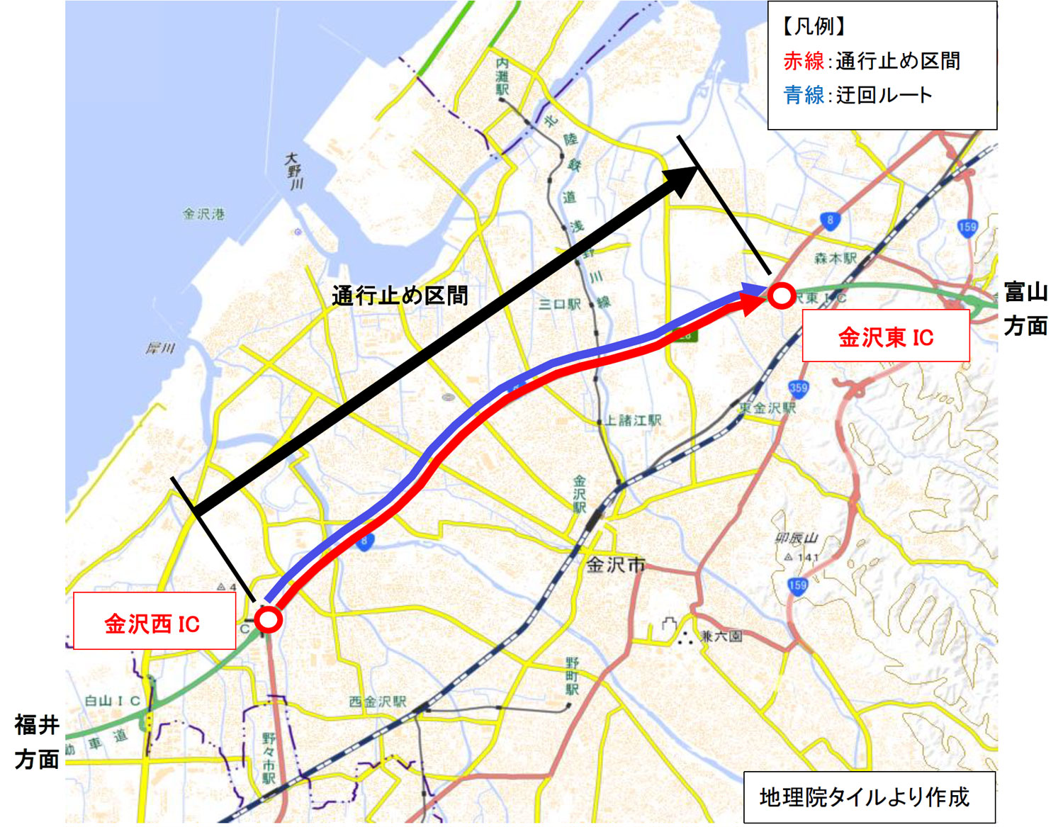 1月21日から続いている警報級の大雪により本線上に多くの雪が残り、走行に支障をきたすおそれがあることと、今後の大雪に備えるため、北陸道・金沢西ICから金沢東IC(上下線)を集中排雪するため通行止めを行っている。