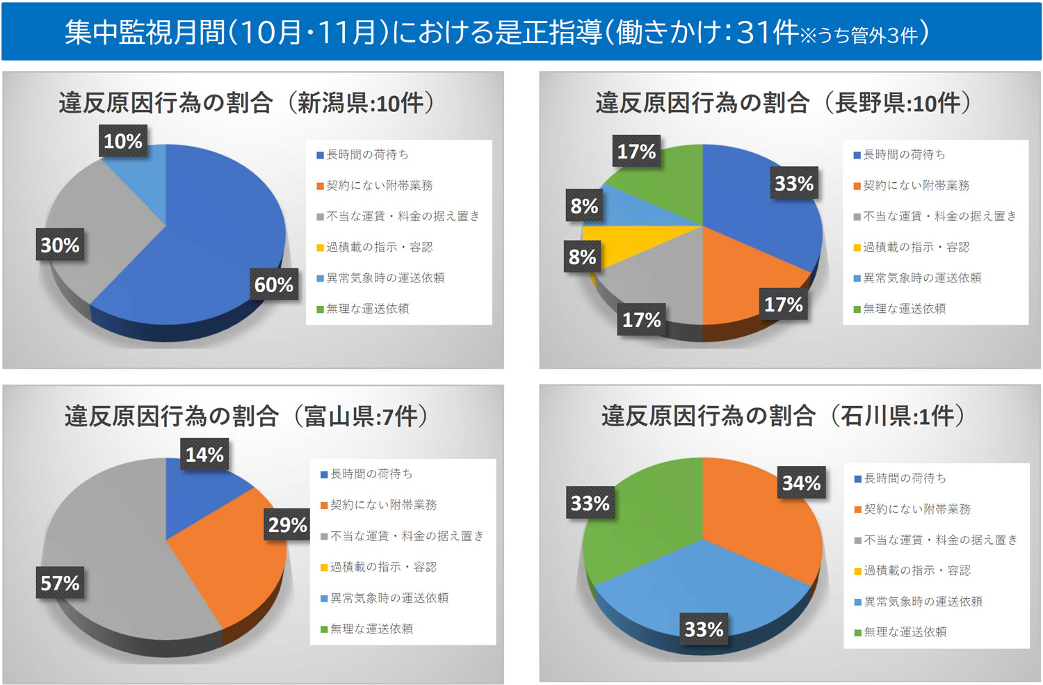 期間中、適正な取引を阻害するおそれのある荷主や元請事業者に対し、31件の「働きかけ」を実施し、違反原因行為の是正による改善を促した。地域別内訳は、新潟県10件、長野県10件、富山県7件、石川県1件、管外3件だった。