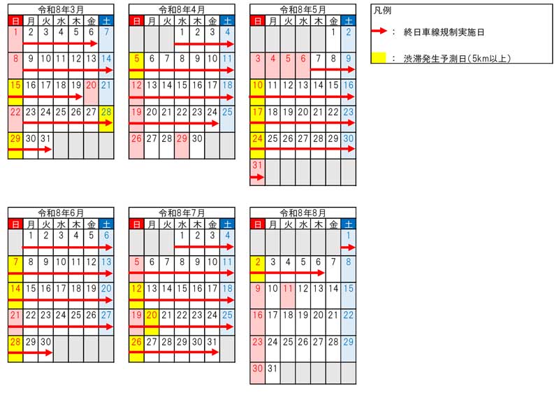 終日車線規制は、土日祝日も実施する。このため、毎週日曜日を中心に渋滞の発生が予測されており、渋滞緩和を図るため、規制区間の迂回やピーク時間帯を避けた利用を呼び掛けている。