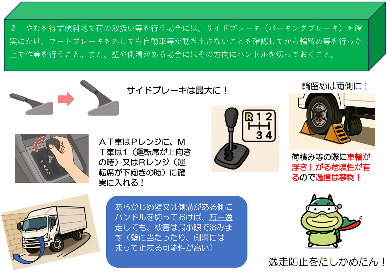 また、やむを得ず傾斜地で荷の取扱い等を行う場合には、サイドブレーキ(パーキングブレーキ)を確実にかけ、フートブレーキを外しても自動車等が動き出さないことを確認してから輪留め等を行った上で作業を行うこと。また、壁や側溝がある場合にはその方向にハンドルを切っておくことを要請している。