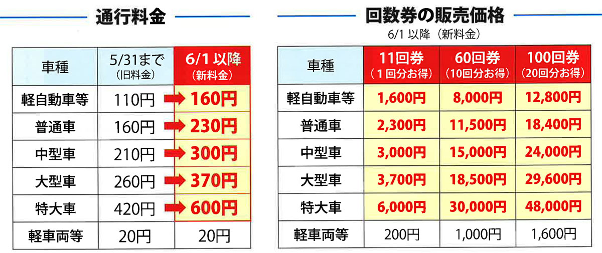現在210円の中型車は300円、260円の大型車は370円、420円の特大車は600円に引き上げられる。なお、回数券も同様に料金が改定され、旧料金の回数券は6月1日以降は利用できない。