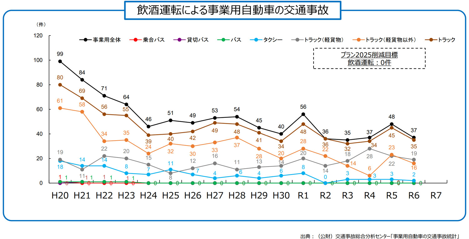 資料によると、事業用自動車による2024年の飲酒運転事故件数は37件で、その内35件がトラックにおける事故で最多となった。内訳は、トラック(軽貨物以外)16件、トラック(軽貨物)19件だった。