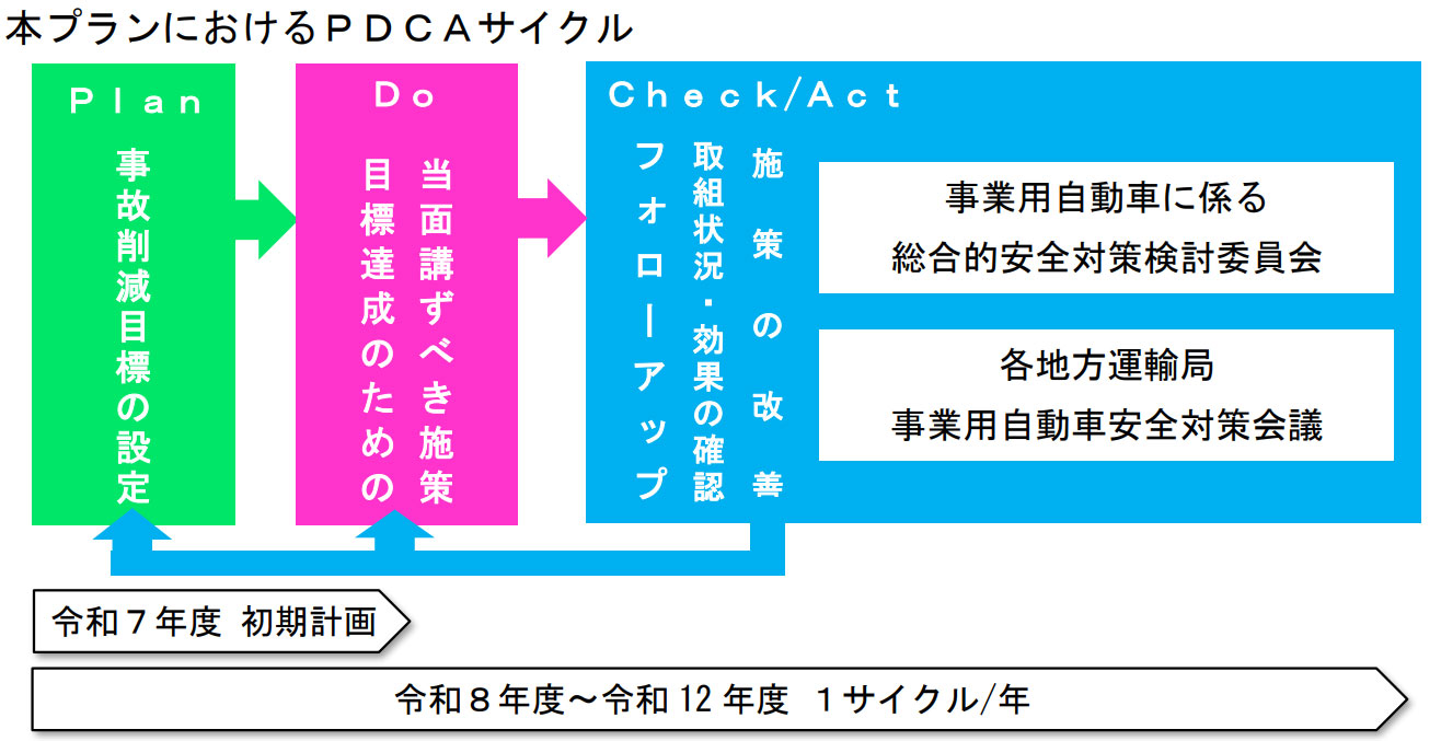 2030年までのトラック(軽除く)の目標指標は、死者数175人以下(0.30類型人/億km以下)、重傷者数820人以下(1.42人/億km以下)、人身事故件5800件以下(10.04件/億km以下)、飲酒運転ゼロ、追突事故件2380件以下(4.12件/億km以下)。