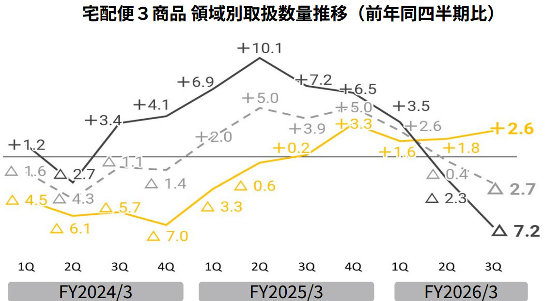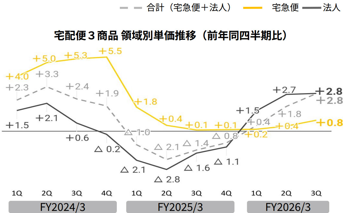 ヤマトホールディングスは、2月2日に発表した2026年3月期第3半期決算説明資料で、主力の宅配便3商品の平均単価を明らかにした。