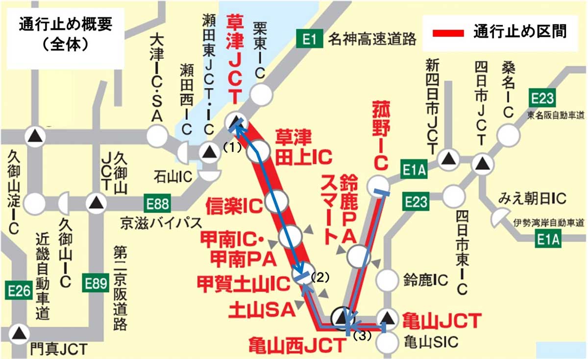 NEXCO中日本とNEXCO西日本は3月23日(月)・24日(火)、新名神・甲賀土山IC~草津JCT(上下線)、菰野IC~甲賀土山IC(下り線)、亀山JCT~亀山西JCT(下り線)を夜間通行止めにする。