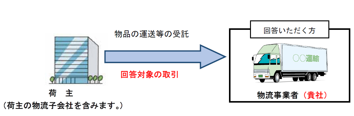 回答対象の「取引の内容」は、自社が荷主から継続的に受託している物品の運送又は保管。「荷主」とは、例えば製造業者、卸売業者、小売業者など、物流事業者以外の事業者を指す。