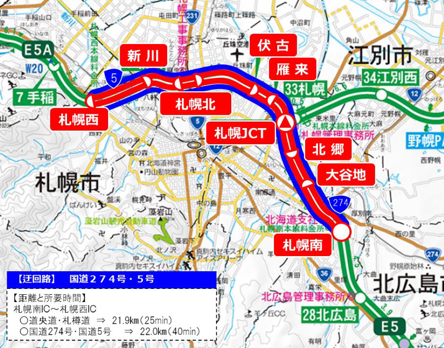 通行止め中は、札幌新道(国道274号・国道5号)などの並行する一般道を利用する。