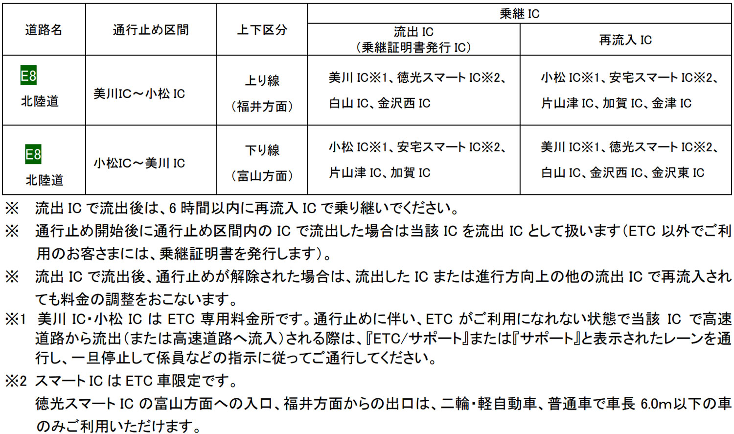 迂回路は、国道8号線を利用する。また、通行止め区間を一般道に迂回し、再度同一方向の高速道路に乗り継ぐ利用者には、迂回せずに直通利用した場合の通行料金より高くならないよう、所定の方法により通行料金の調整を行う。