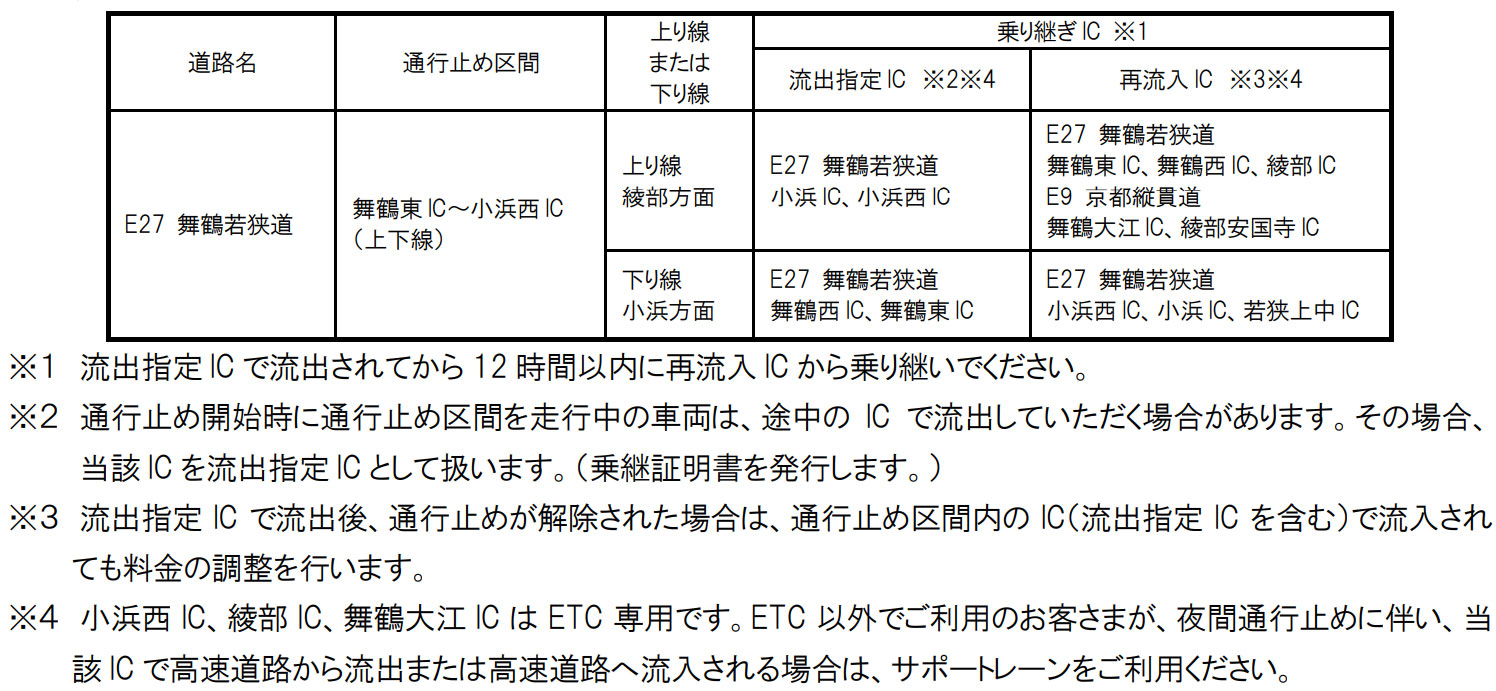 NEXCO西日本関西支社は、2月12日22時~翌4時、舞鶴若狭道・舞鶴東IC~小浜西ICで、排雪作業に伴う夜間通行止めを実施する。