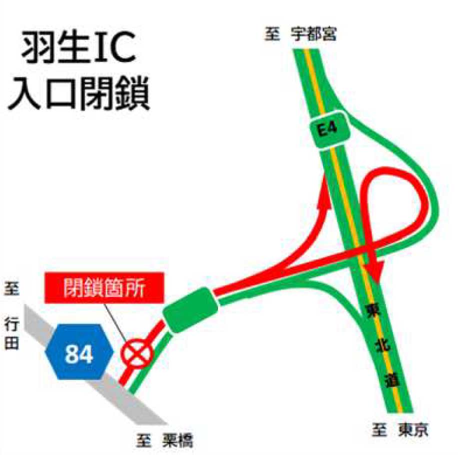 羽生IC入口ランプに接続する県道84号線(羽生栗橋線)で舗装補修工事を行うため。閉鎖時間は各日夜21時~翌朝5時。予備日は土日を除く3月6日(金)~13日(金)。