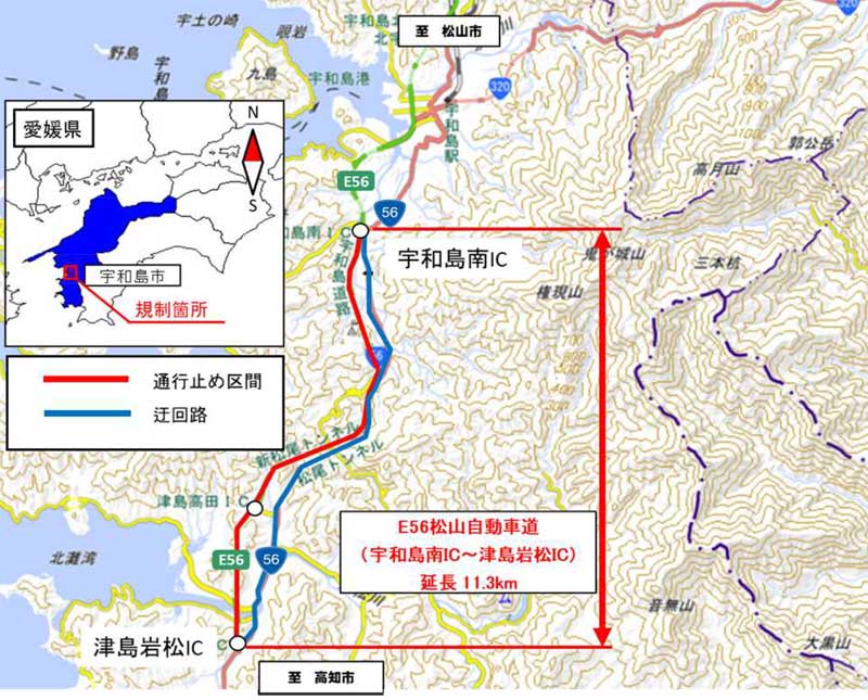 - 松山道/新松尾トンネル事故対策のため2月20日・21日、宇和島南IC~津島岩松ICを夜間通行止め (02月16日)