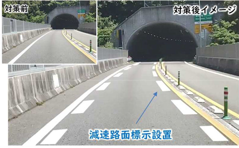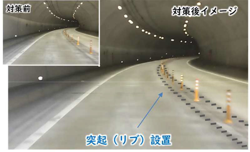 中央付近に、車両が通過すると振動が発生する突起を設置する他、トンネルに進入する前に車両速度を低下させるよう路面標示を設置する。