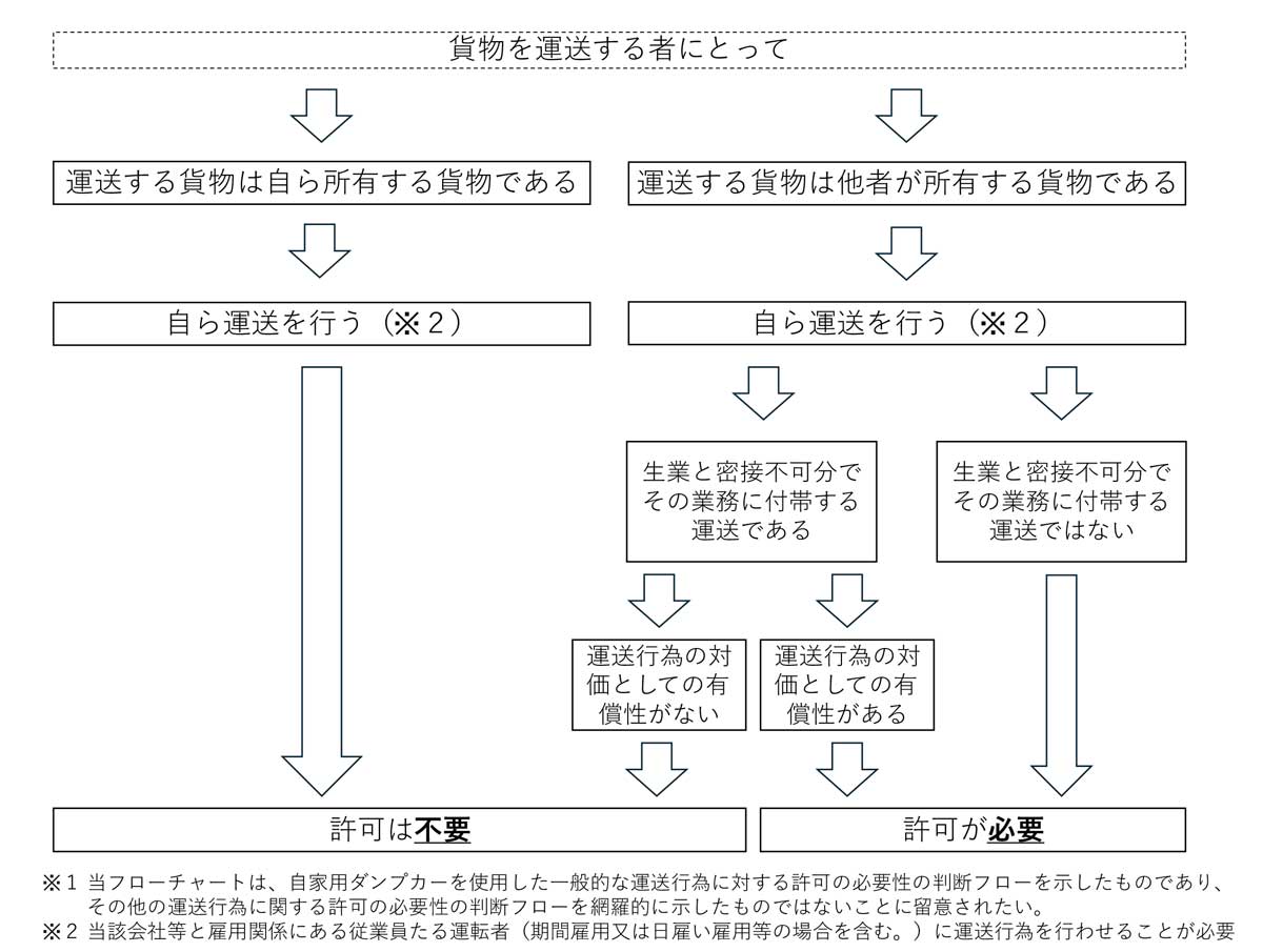 一方、「建設関連会社等が自ら所有する貨物を自ら運送する場合」、「建設関連会社等の生業と密接不可分であり、その業務に付帯するものとして運送を行う場合」は、法の許可は不要になる。