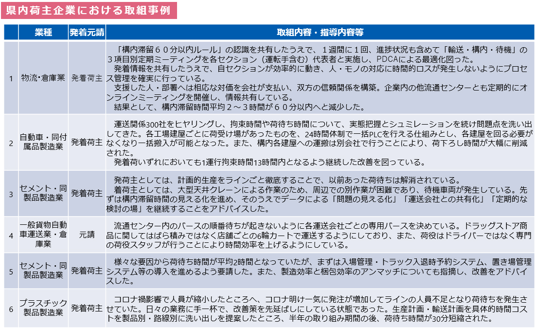 労働局労働時間適正化指導員は、あわせて労働環境改善の好事例の収集・普及を担っており、現在、栃木県内荷主企業6社の取り組み事例を公開している。