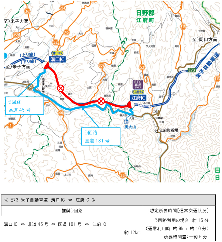迂回路は、県道45号、国道181号を利用する。また、通行止めにより、高速道路を流出指定ICで一旦流出し、一般道をう回して再流入ICから再度同一方向の高速道路に乗り継ぐ利用客には、高速道路の通行料金が割高にならないよう所定の方法で調整する。