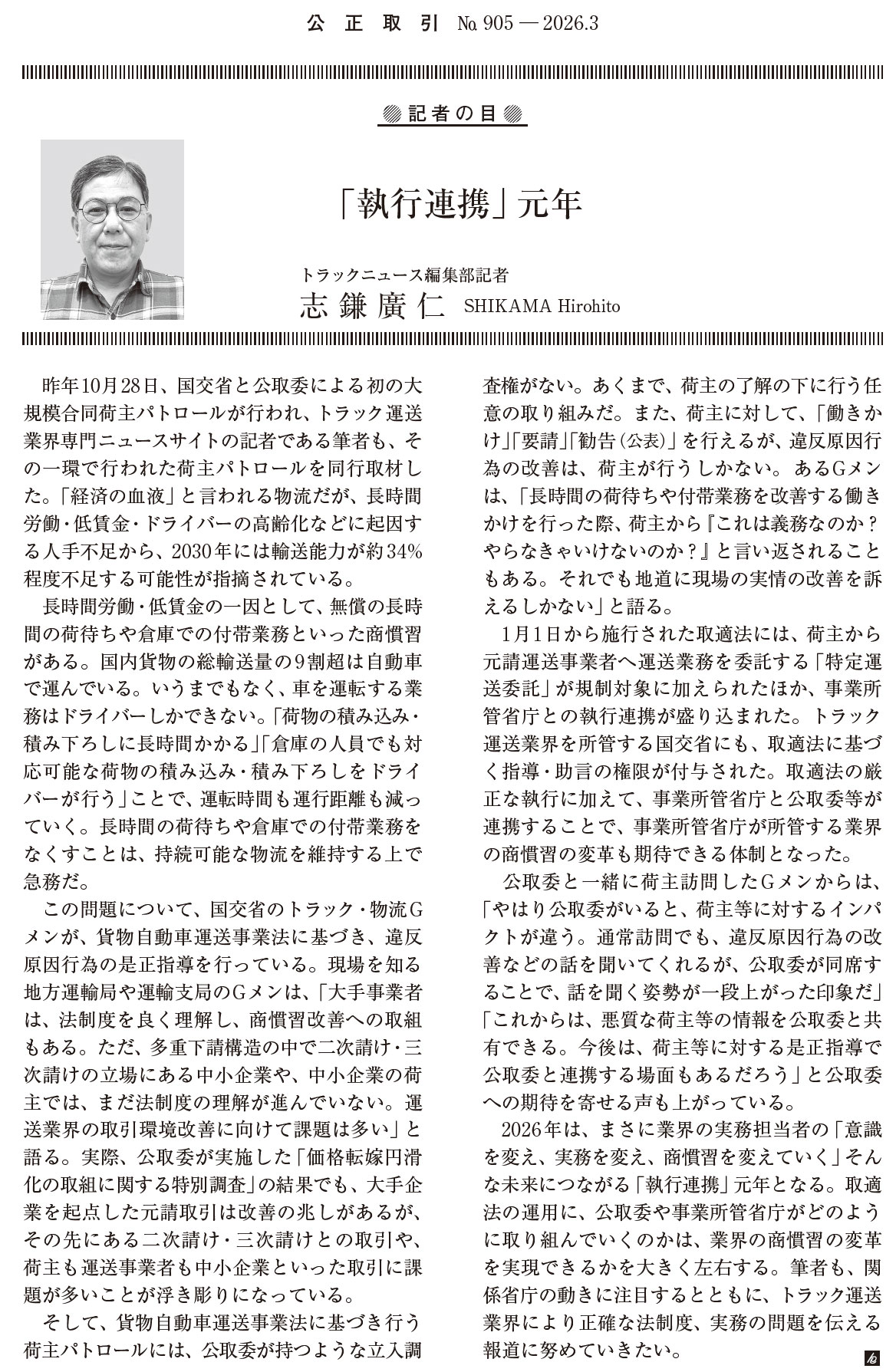 トラックニュース/月刊『公正取引』26年3月号に寄稿「トラック・物流Gメンと取適法の執行連携」紹介