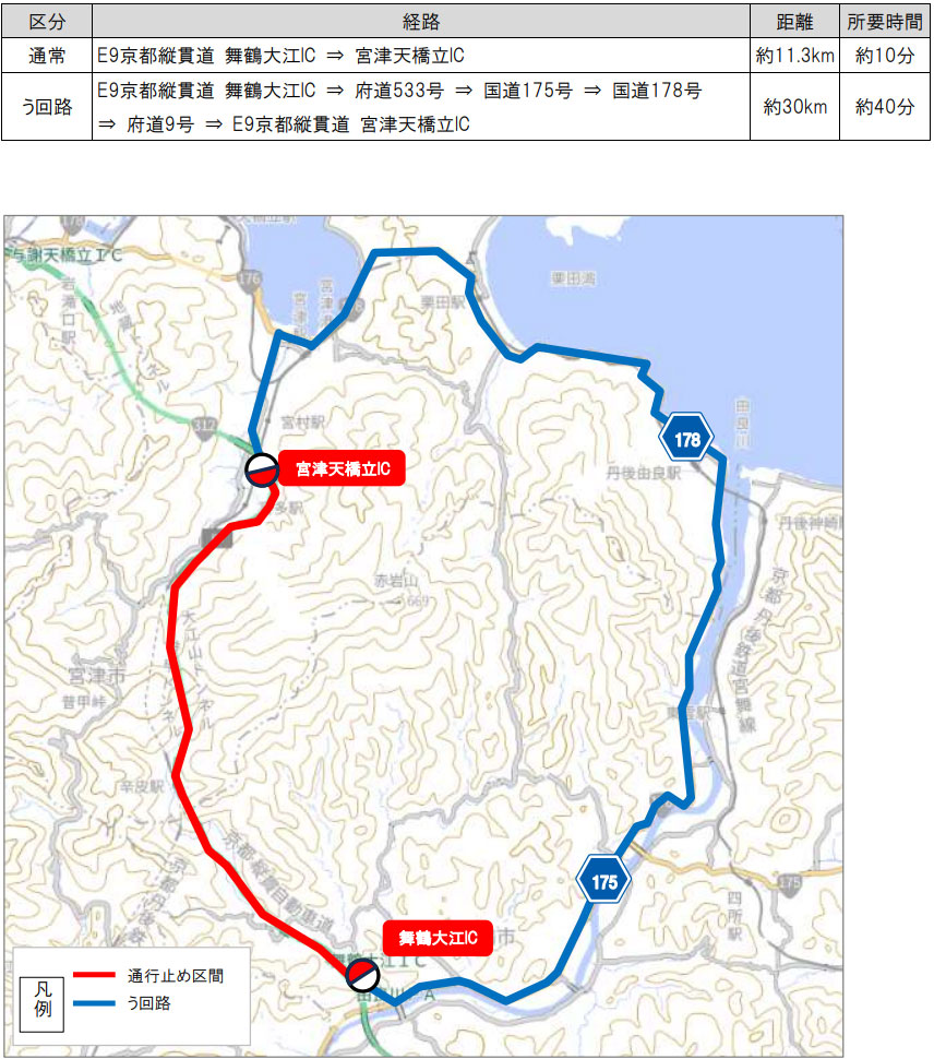 迂回路は、舞鶴大江IC→府道533号→国道175号→国道178号→府道9号→京都縦貫道・宮津天橋立ICとなる。所要時間が通常約10分が約40分となるため、注意を呼び掛けている。