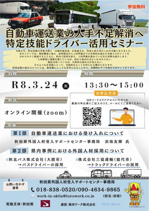 秋田県は、特定技能ドライバー活用セミナーを3月24日(火)に開催する。