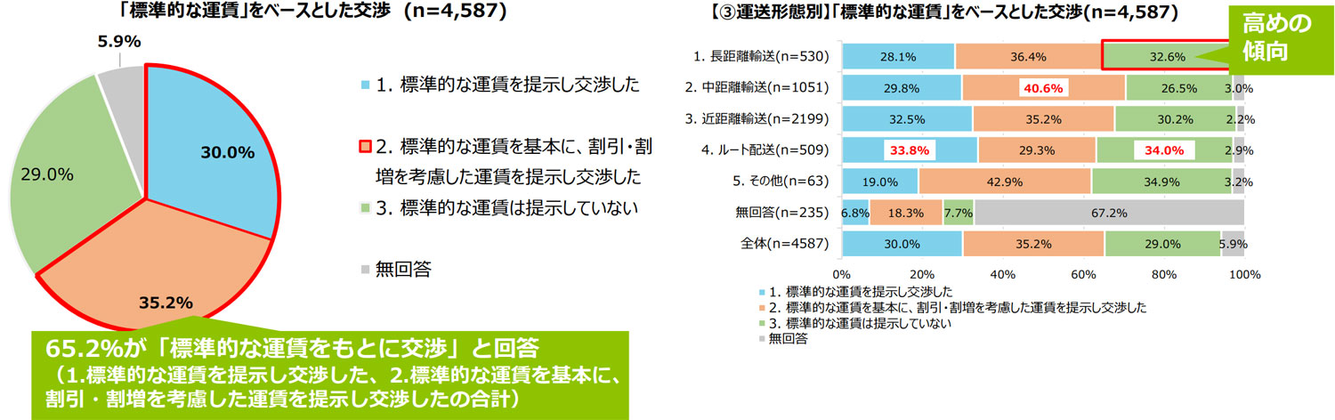 「標準的な運賃」をベースにした運賃交渉について尋ねたところ、「標準的な運賃を提示し交渉した」30.0%、「標準的な運賃を基本に、割引・割増を考慮した運賃を提示し交渉した」35.2%となり、全体では65.2% が「標準的な運賃をもとに交渉」していた。一方で、29.0%は「標準的な運賃は提示していない」との結果となった。