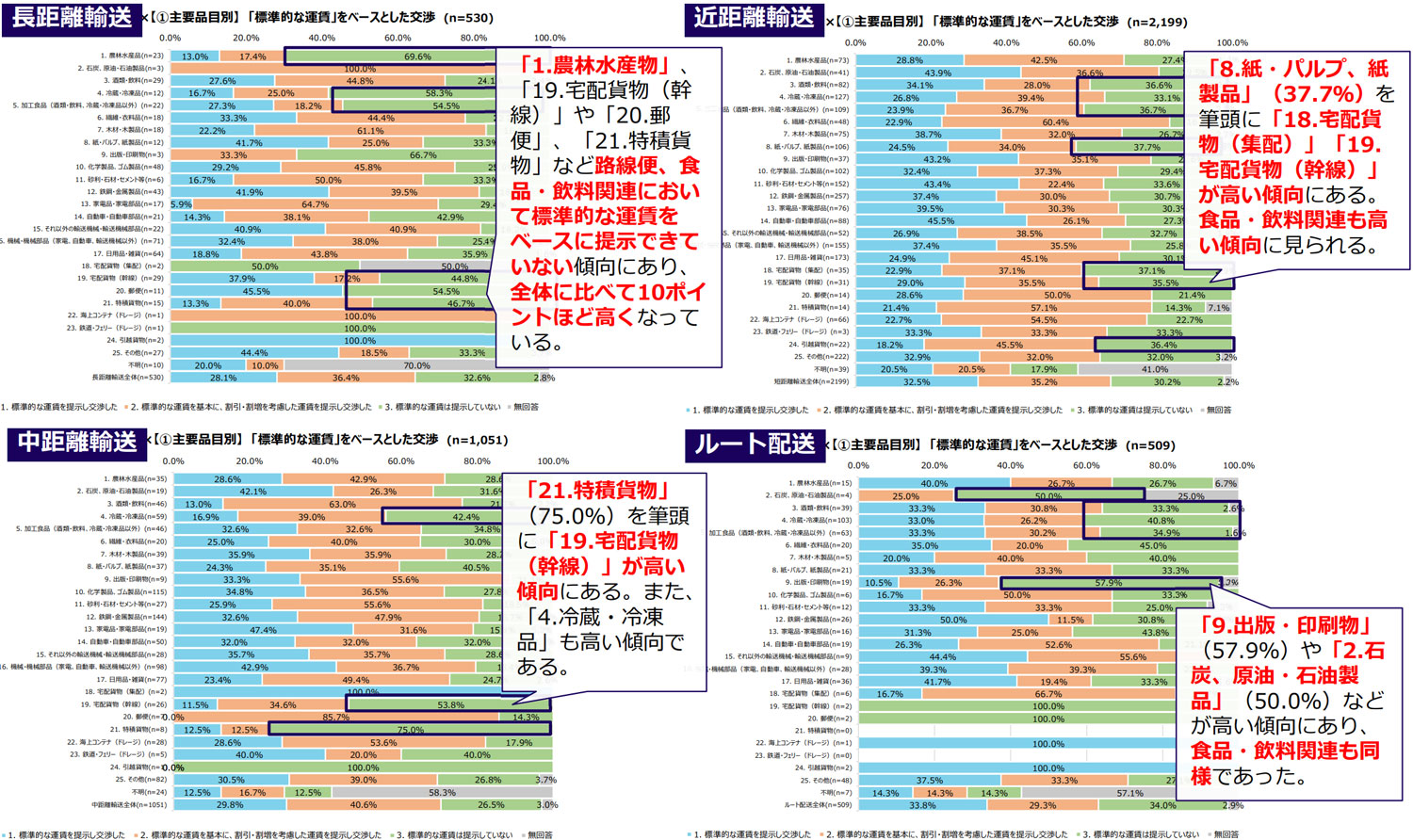 また、運送形態別×主要品目別では、長距離輸送は「標準的な運賃は提示していない」割合が全体的に高い傾向にあった。中長距離では「宅配貨物(幹線)」や「特積貨物」など路線便に、近距離・ルート配送では食品・飲料関連において標準的な運賃をベースに提示できていない傾向が高かった。