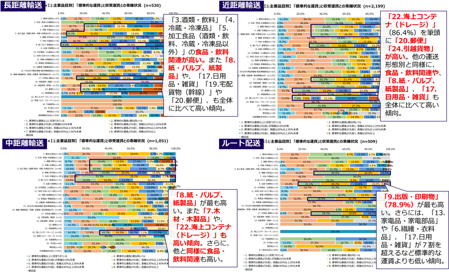また、運送形態別では、輸送距離が長いほど、標準的な運賃より低い収受傾向が見られた。運送形態別×主要品目別では、食品・飲料関連や「宅配貨物(幹線)」「郵便」「海上コンテナ(ドレージ)」がより「標準的な運賃よりも低い」割合が高い結果となった。