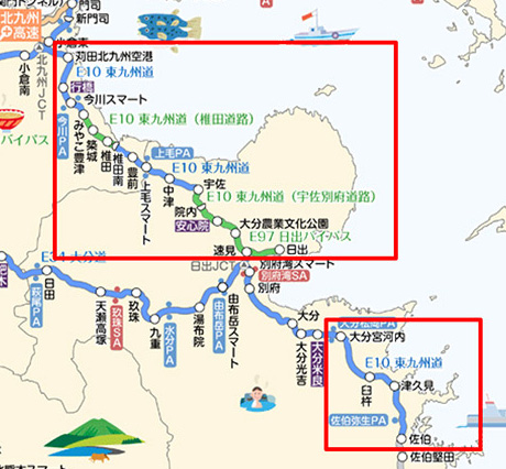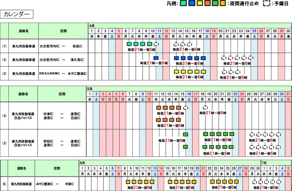 東九州道の規制区間と規制日は、「大分宮河内IC~佐伯IC」が4月6日夜から10日朝まで、「大分宮河内IC~津久見IC」が4月10日夜から18日朝まで、「苅田北九州空港IC~みやこ豊津IC」が4月13日夜から18日朝まで、「中津IC~速見IC」5月11日夜から15日朝まで、「宇佐IC~速見IC」が5月15日夜から23日朝まで、「みやこ豊津IC~中津IC」が6月8日夜から7月4日朝まで。