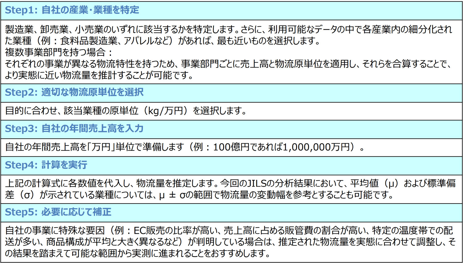 具体的には、「実測」「単位数量当たりの重量×数量(個数など)」「容積を該当する対象貨物の重量に換算」「トラックの最大積載量又は平均積載量×台数」などがあり、その中の一つとして、「売上額又は仕入額÷単位重量当たりの額」を用いて、荷主企業の売上高から物流量を推計する方法が示されている。